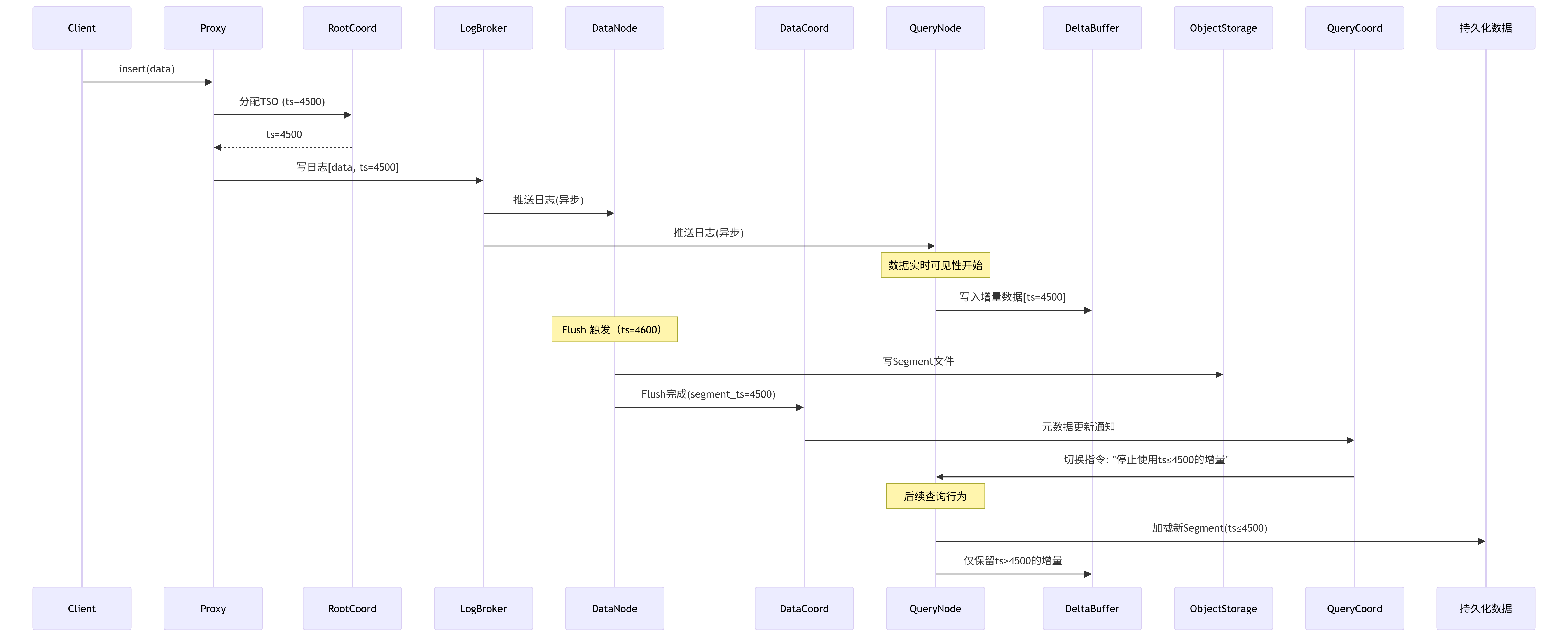- 实时合并:Query Node在查询时动态合并基础数据+增量变更,呈现最新视图